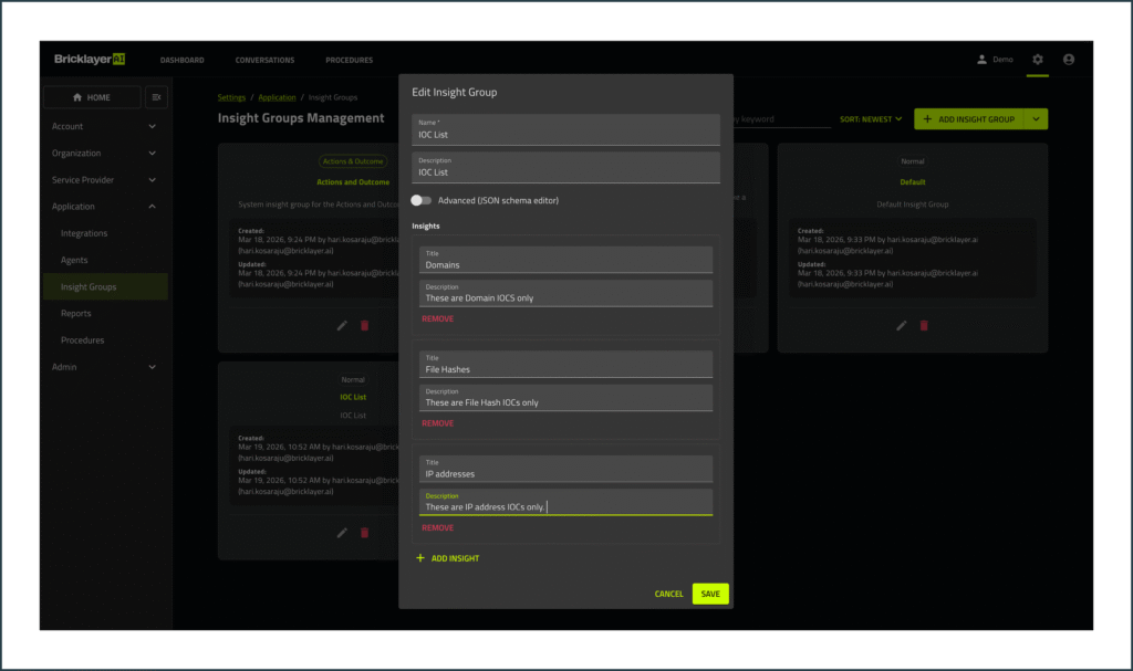With the latest Bricklayer platform release, we are introducing Insights, Insight Groups, and Mentions as part of Multi-Agent Context Engineering (MACE) — our system architecture that defines how investigative context is created, accumulated, and shared across AI agents.